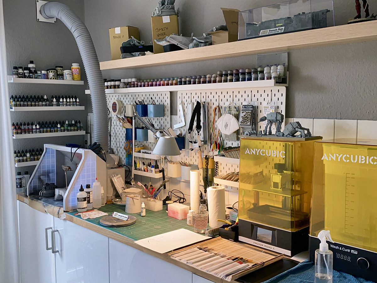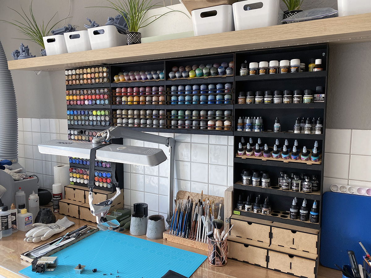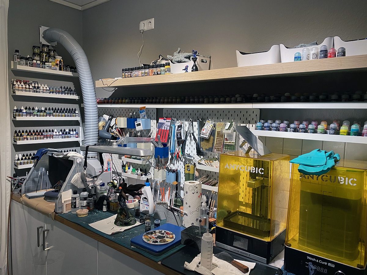 A few paints and some inferior brushes from the internet were quickly joined by more paints. Then better brushes, an airbrush gun and cabin, washes, diorama pastes, glue, polystyrene sheets, miniature bases, a Proxxon, suitable drills, milling and sanding bits, artificial snow and sandpaper. Then a sanding disc, a second, larger 3D printer, more resin, a hot wire cutter, even better brushes, putty and tufts and other terrain building equipment. On the first holiday after my first painted figures, I found myself sitting on the beach like a child, collecting sand and small branches - much to the amusement of my wife and my 12-year-old son. I now spent my evenings watching videos by popular YouTubers to learn or try out techniques. And, of course, painting. My collection of painting utensils and finished figures grew rapidly, and eventually I cleared out the old kitchen in my office and spread my hobby there. I now had well over 450 different paints from a wide range of manufacturers.