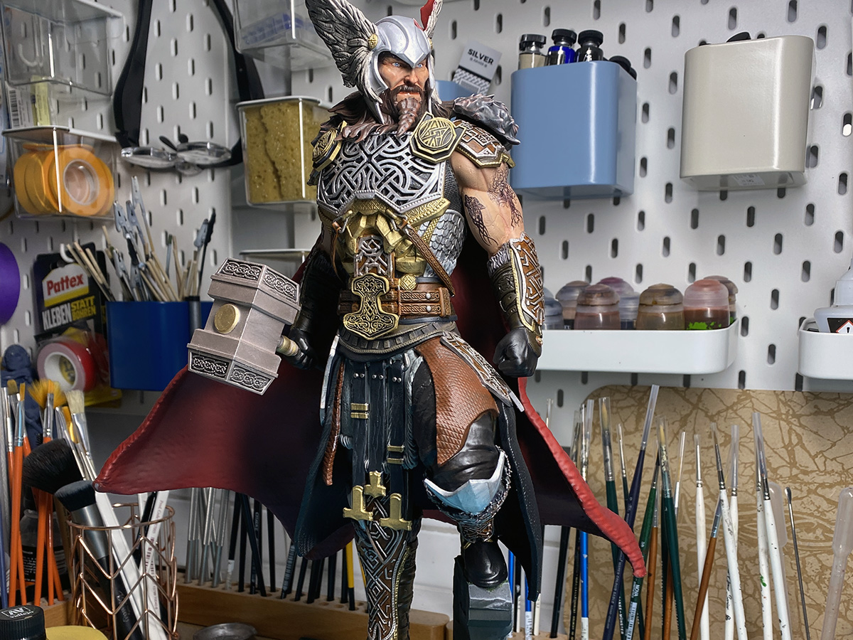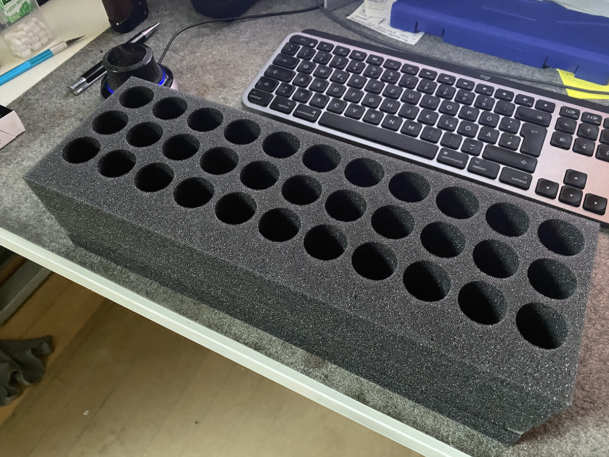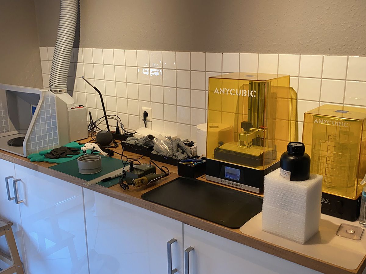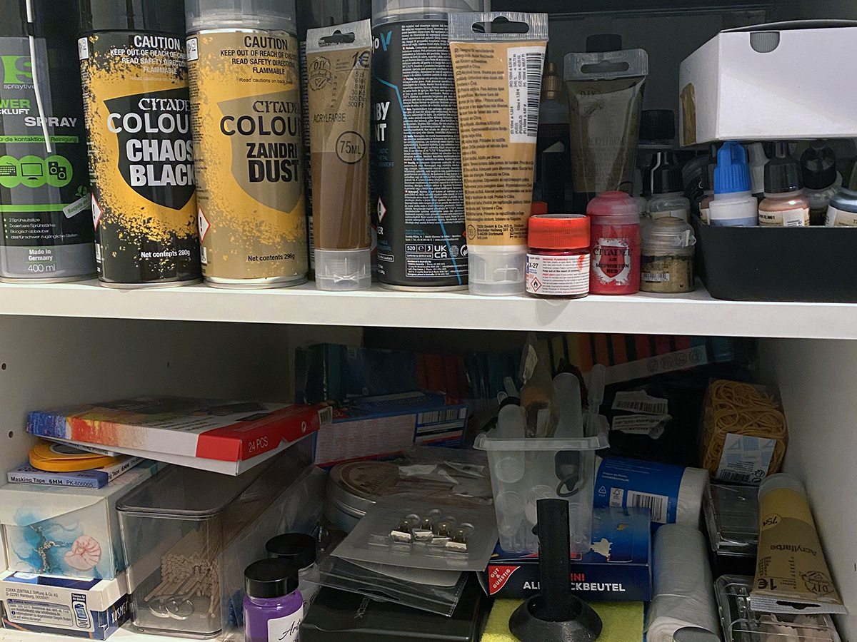A few paints and some inferior brushes from the internet were quickly joined by more paints. Then better brushes, an airbrush gun and cabin, washes, diorama pastes, glue, polystyrene sheets, miniature bases, a Proxxon, suitable drills, milling and sanding bits, artificial snow and sandpaper. Then a sanding disc, a second, larger 3D printer, more resin, a hot wire cutter, even better brushes, putty and tufts and other terrain building equipment. On the first holiday after my first painted figures, I found myself sitting on the beach like a child, collecting sand and small branches - much to the amusement of my wife and my 12-year-old son. I now spent my evenings watching videos by popular YouTubers to learn or try out techniques. And, of course, painting. My collection of painting utensils and finished figures grew rapidly, and eventually I cleared out the old kitchen in my office and spread my hobby there. I now had well over 450 different paints from a wide range of manufacturers.