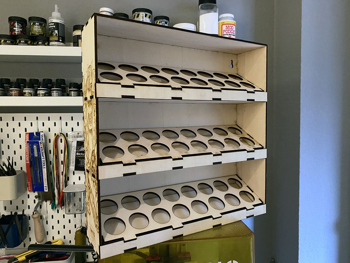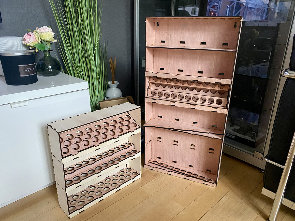 Over the following weeks I built several of the shelves in the three versions, designed and cut inserts for all my paints and rearranged my hobby den. I also created several different types of inserts, as I wanted to accommodate the maximum number of paint bottles in each compartment, depending on the type and size. This resulted in a total of five insert types: Planar, Step, Slope, Drawer and Foam.